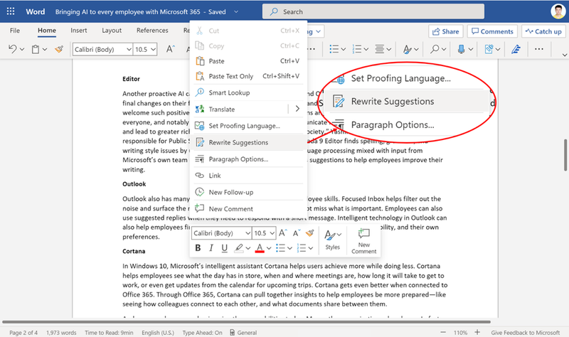 Built into Microsoft Word is Rewrite Suggestions that can offer ideas to help you rephrase sentences for more impact or clarity while staying true to your original meaning.