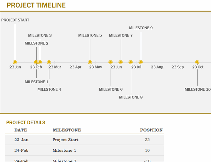 This accessible timeline helps create a visual roadmap of your project. Simply enter key milestones into the Project Details table and watch your project take shape in the timeline above.